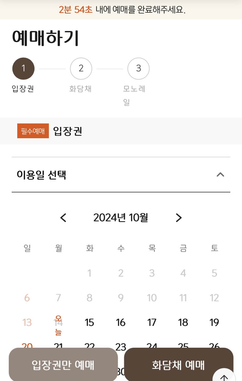 입장권, 화담채, 모노레일 순서대로 예매가능합니다. 예매 시 입장권은 필수 예매, 화담채 및 모노레일은 선택예매이므로 건너뛰기 가능합니다.