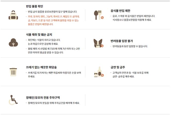 곤지암 화담숲 방문 시 쾌적한 관람 및 식물 보호를 위해 아래와 같은 에티켓을 지켜주세요.